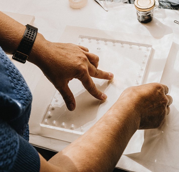 Chaque tirage est retravaillé individuellement à la main – variation dans la répétition, à la manière d’un chant psalmodié