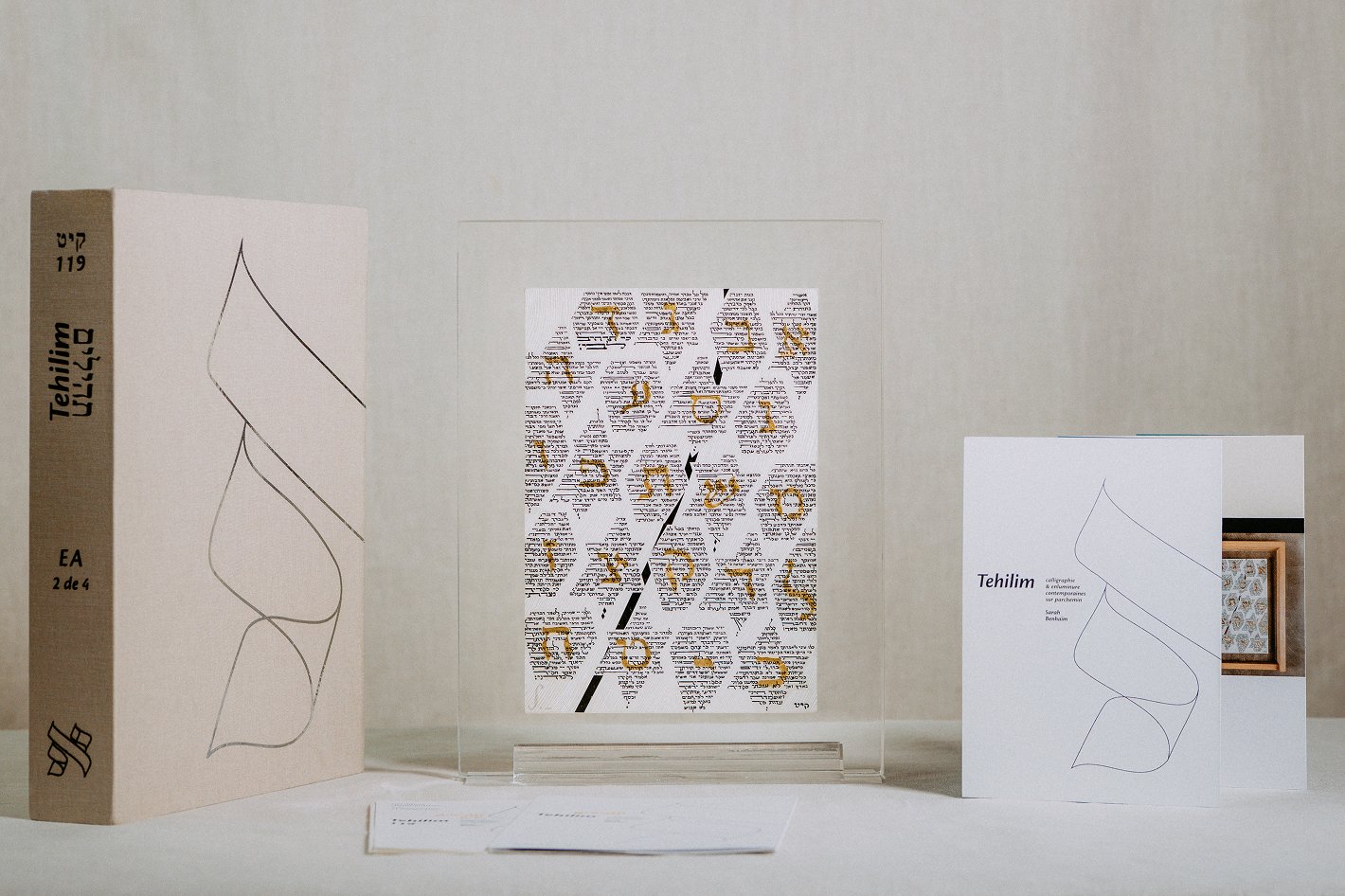 Projet de transcription calligraphique et d’enluminure contemporaine des 150 Psaumes de David sur parchemin (vélin), tendu sur plexiglass. L’ensemble compose un tableau-livre monumental, croisant tradition hébraïque et langage visuel contemporain. L’œuvre originale manuscrite donne lieu à une série limité à 22 exemplaires sérigraphiés sur parchemin également tendu sur plexiglass.